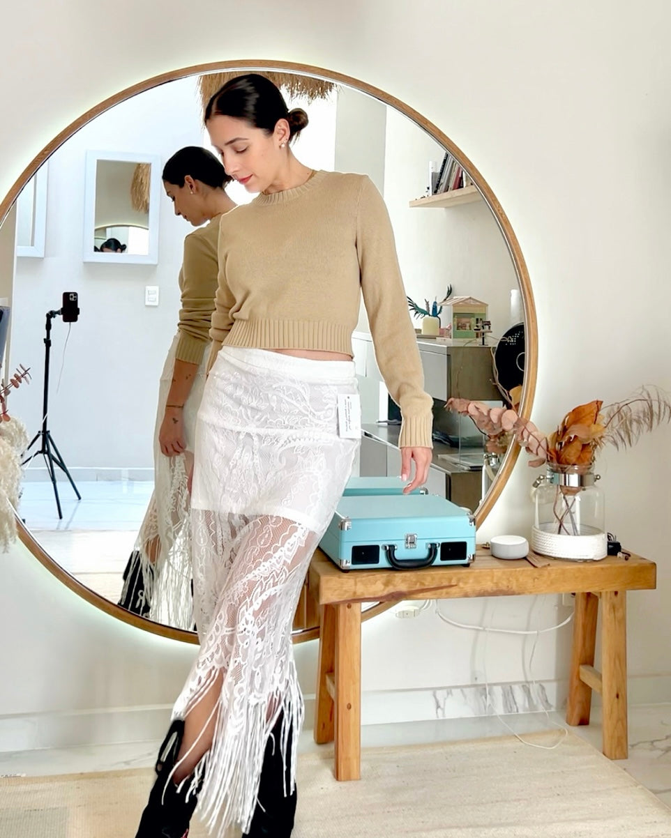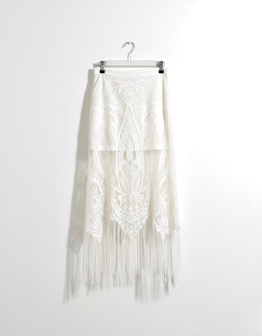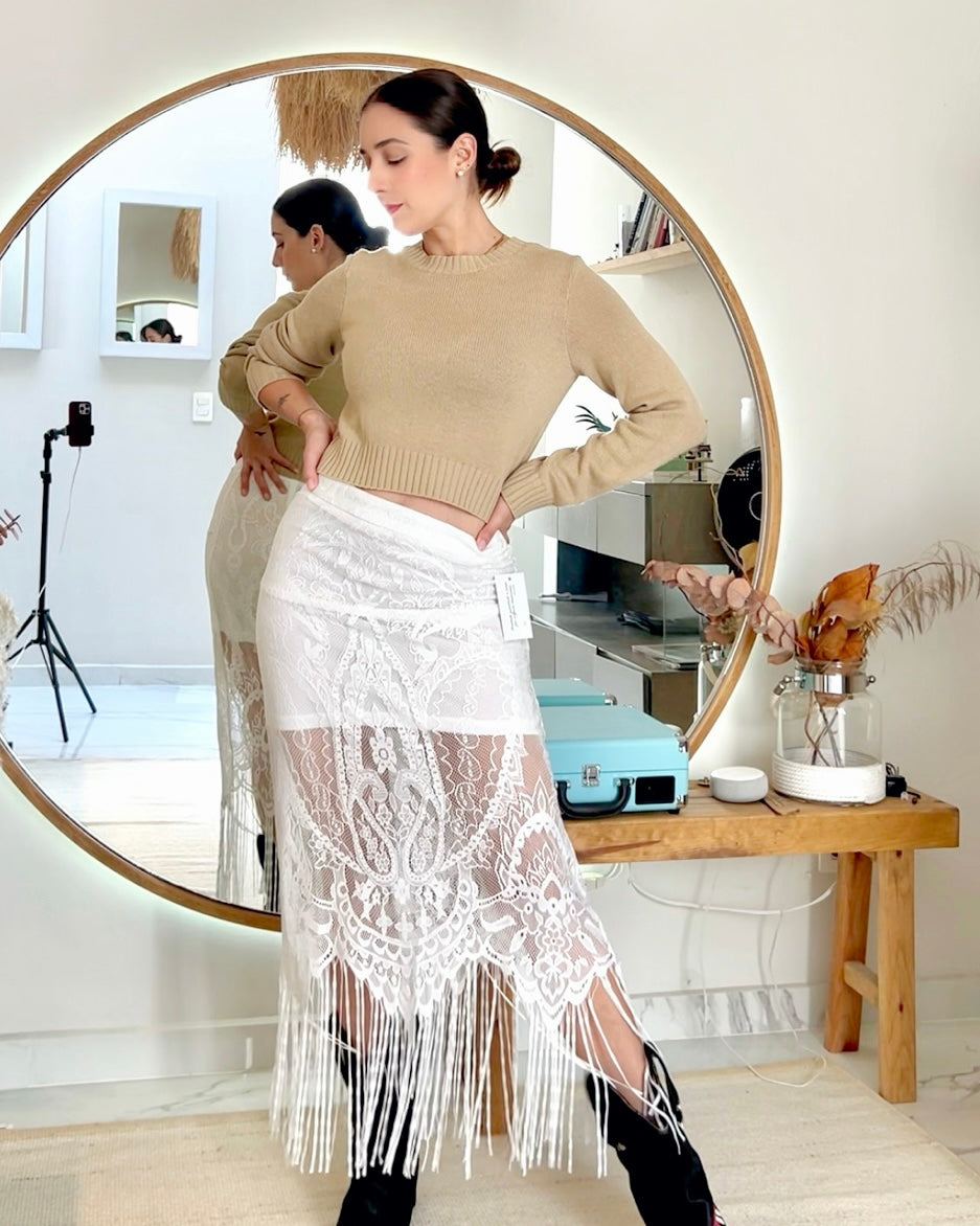 Falda de encaje con flecos estilo boho.